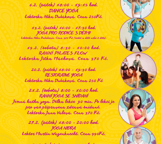 Kromě jógy naleznete v rozvrhu také tanec, přednášky, workshopy, semináře. Dále masáže a terapie.